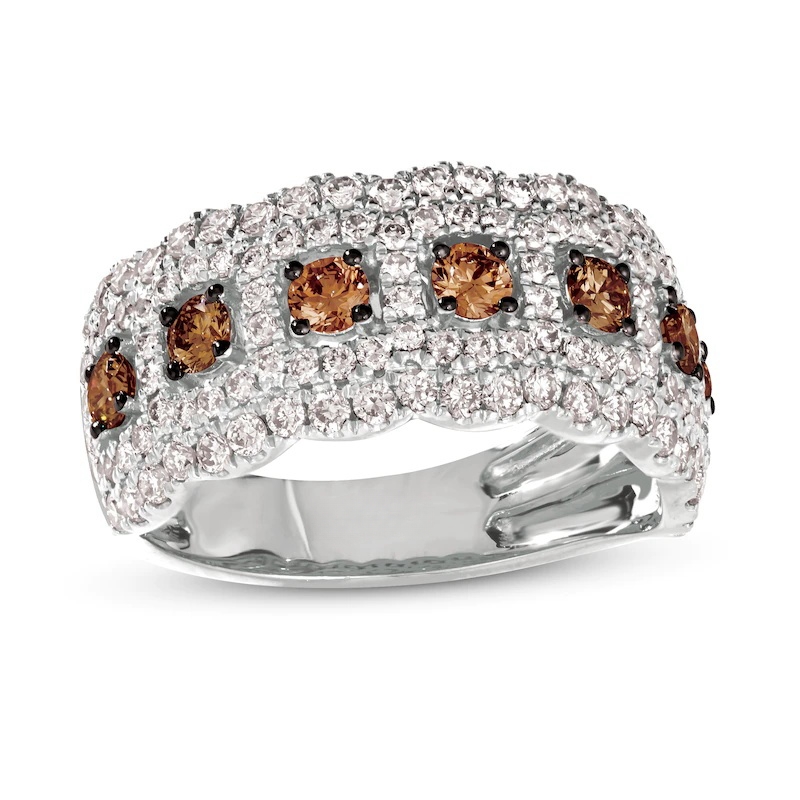 This ring is available in limited sizes. If you don’t see your size here, please visit a store to order your ring. This marvelous diamond ring for her is fashioned of delicious 14K Vanilla Gold, and is awash with sparkling round Nude Diamonds along the edge of the band. The center of the ring features a ribbon of decadent round-cut Chocolate Diamonds to give the ring a total diamond weight of 1 1/2 carats.